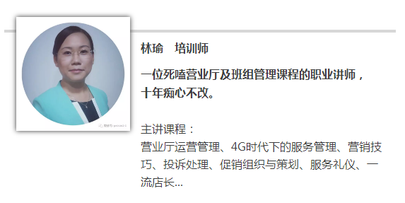 * 培訓(xùn)師林瑜客戶服務(wù)營銷實(shí)戰(zhàn)派講師; * 16年專注于營業(yè)廳一線、裝維一線、客服一線,專注服務(wù)提升、投訴處理、銷售技巧、廳店運(yùn)營、基層班組長課程,在這個(gè)領(lǐng)域里精耕細(xì)作,做專、做精,塑就市場與學(xué)員好口碑; * 累計(jì)為中國移動(dòng)、中國聯(lián)通、中國電信多個(gè)省、市公司提供培訓(xùn)超千場, 累計(jì)參訓(xùn)人..