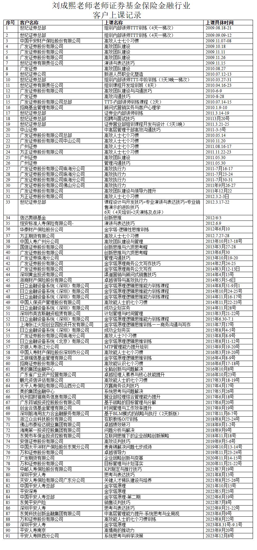 劉成熙老師服務(wù)的證券基金保險(xiǎn)金融行業(yè)授課授課客戶: