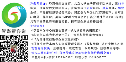 許浩明老師的簡(jiǎn)單介紹: 1、北京大學(xué)光華管理學(xué)院畢業(yè)、近十三年華為管理實(shí)戰(zhàn)經(jīng)驗(yàn);北大光華碩士論文是《華為管理實(shí)踐》方面的課題,對(duì)華為管理進(jìn)行深入研究,而且有豐富華為管理實(shí)戰(zhàn)經(jīng)驗(yàn)。 2、在華為三大核心體系都奮斗歷練過(guò)的前華為部長(zhǎng);曾在華為獲“華為金牌團(tuán)隊(duì)獎(jiǎng)”&ldquo..