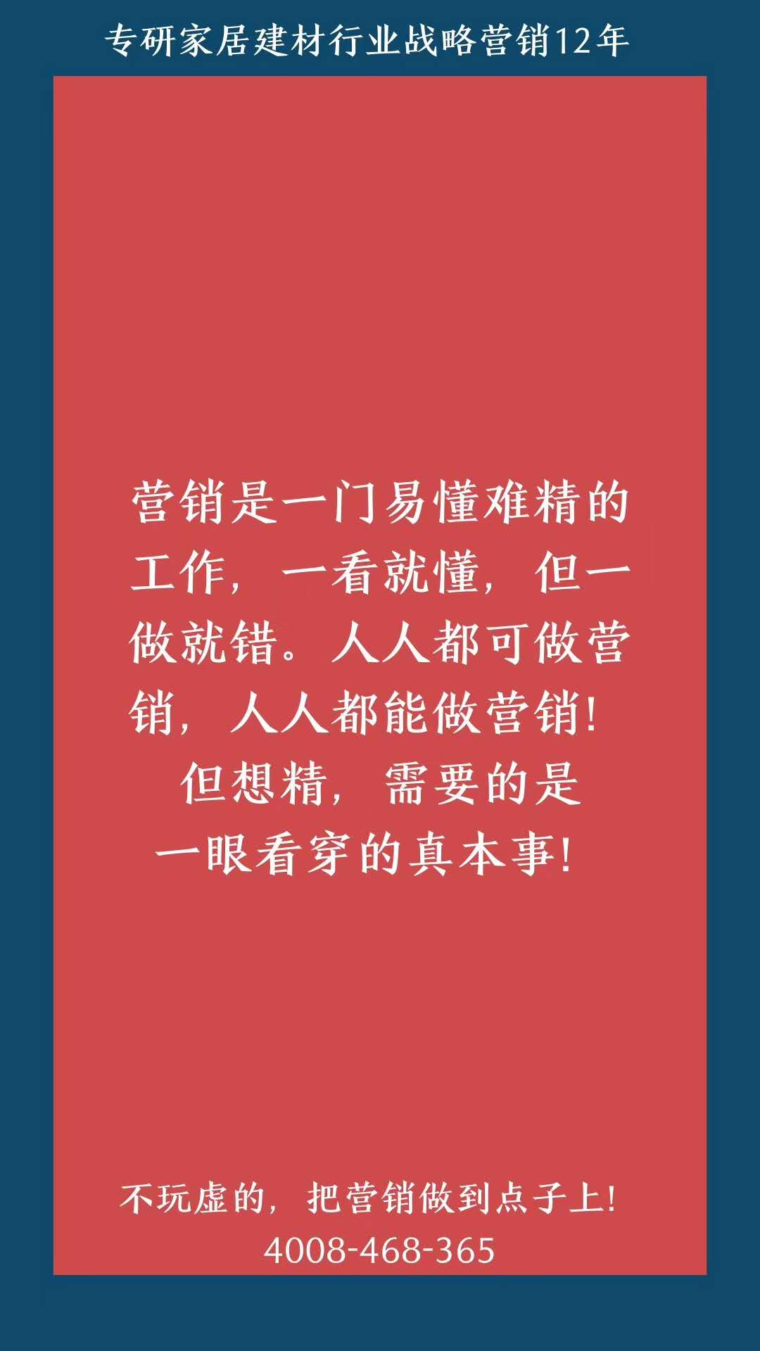 專注家居建材行業(yè)戰(zhàn)略營(yíng)銷咨詢12年 北京和君智業(yè)教育科技有限公司總經(jīng)理 中國(guó)家居建材行業(yè)戰(zhàn)略營(yíng)銷研究中心發(fā)起人 大商公司化運(yùn)營(yíng)專業(yè)顧問(wèn) 資深實(shí)戰(zhàn)派講師 戰(zhàn)略營(yíng)銷語(yǔ)錄:進(jìn)門難! 營(yíng)銷是一門易懂難精的工作,一看就懂,但一做就錯(cuò)。 人人都可做營(yíng)銷,人人都能做營(yíng)銷! 但想精,需要的是一眼看穿的真本事!