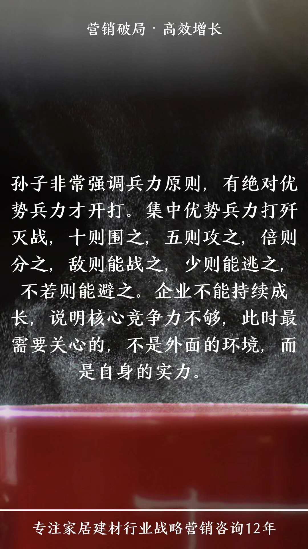 孫子非常強(qiáng)調(diào)兵力原則,有絕對(duì)優(yōu)勢(shì)兵力才開打。集中優(yōu)勢(shì)兵力打殲滅戰(zhàn),十則圍之,五則攻之,倍則分之,敵則能戰(zhàn)之,少則能逃之,不若則能避之。企業(yè)不能持續(xù)成長,說明核心競(jìng)爭(zhēng)力不夠,此時(shí)最需要關(guān)心的,不是外面的環(huán)境,而是自身的實(shí)力。