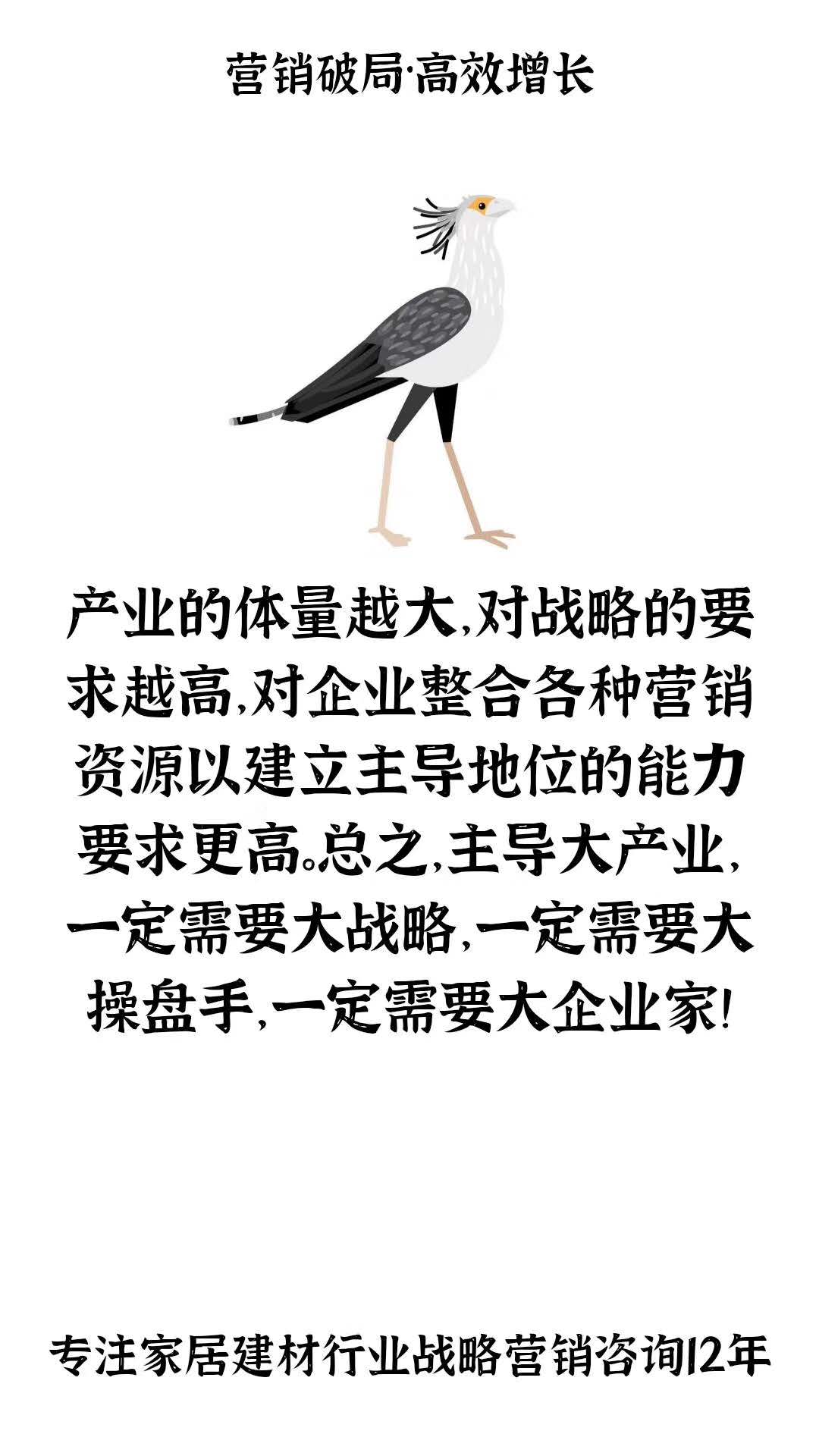 產(chǎn)業(yè)的體量越大,對(duì)戰(zhàn)略的要求越高,對(duì)企業(yè)整合各種營銷資源以建立主導(dǎo)地位的能力要求更高。 總之,主導(dǎo)大產(chǎn)業(yè),一定需要大戰(zhàn)略,一定需要大操盤手,一定需要大企業(yè)家!