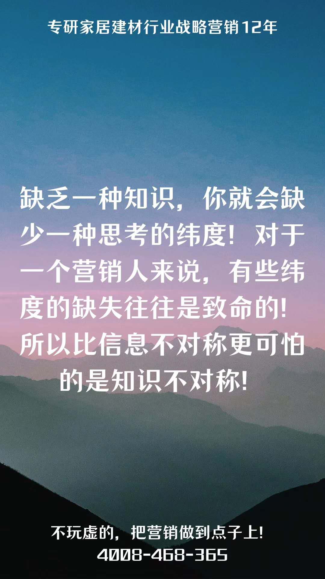 劉登榜 專注家居建材行業(yè)戰(zhàn)略營銷咨詢12年 北京和君智業(yè)教育科技有限公司總經(jīng)理 中國家居建材行業(yè)戰(zhàn)略營銷研究中心發(fā)起人 大商公司化運(yùn)營專業(yè)顧問 資深實(shí)戰(zhàn)派講師 戰(zhàn)略營銷語錄:信息無效! 缺乏一種知識(shí),你就會(huì)缺少一種思考的緯度! 對(duì)于一個(gè)營銷人來說,有些緯度的缺失往往是致命的! 所以比信息不對(duì)稱更可怕的是知識(shí)不對(duì)稱! ![]() 【怕停滯,找登榜,戰(zhàn)略營銷助增長!】 |