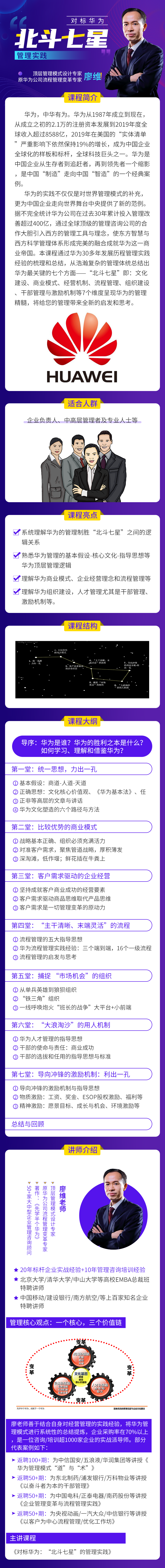 華為的實踐不僅僅是對世界管理模式的補充,更為中國企業(yè)走向世界舞臺中央提供了新的范例。據(jù)不完全統(tǒng)計華為公司在過去30年累計投入管理改善超過400億,通過全球頂級的管理咨詢公司的合作大膽引入西方的管理工具與理念,使東方智慧與西方科學(xué)管理體系形成完美的融合成就華為這一商業(yè)帝國。本課程通過華為30多年發(fā)展歷程管理實踐經(jīng)驗的梳理和總結(jié),從浩瀚復(fù)雜的管理體統(tǒng)總結(jié)出華為最關(guān)鍵的七個方面———“北斗七星”即:文化建設(shè)、商業(yè)模式、經(jīng)營機制、流程管理、組織建設(shè)、干部管理與激勵機制等7個維度呈現(xiàn)華為的管理精髓,將給您的管理帶來全新的啟發(fā)和思考。