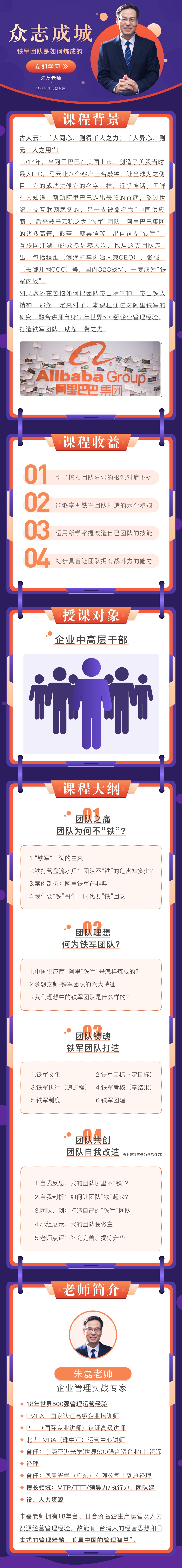 如果您還在苦惱如何把團(tuán)隊(duì)帶出精氣神,帶出鐵人精神,那您一定來對(duì)了。本課程通過對(duì)阿里鐵軍的研究,融合講師自身18年世界500強(qiáng)企業(yè)管理經(jīng)驗(yàn),打造鐵軍團(tuán)隊(duì),助您一臂之力!