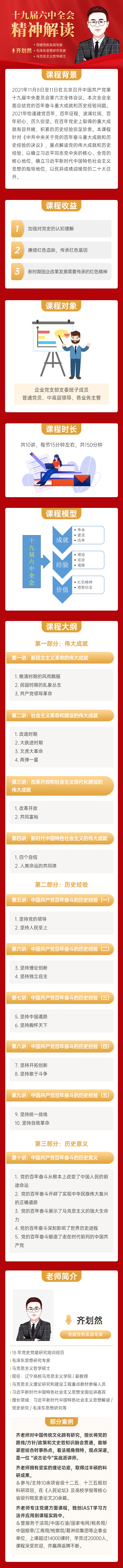 2021年11月8日至11日在北京召開中國共產(chǎn)黨第十九屆中央委員會第六次全體會議。本次全會全面總結(jié)黨的百年奮斗重大成就和歷史經(jīng)驗問題。2021年恰逢建黨百年,百年征程,波瀾壯闊,百年初心,歷久彌堅。在百年黨史上取得的重大成就有目共睹,積累的歷史經(jīng)驗彌足珍貴。本課程針對《中共中央關(guān)于黨的百年奮斗重大成就和歷史經(jīng)驗的決議》,重點解讀黨的偉大成就和歷史經(jīng)驗,以確立習(xí)近平同志黨中央的核心、全黨的核心地位,確立習(xí)近平新時代中國特色社會主義思想的指導(dǎo)地位,以優(yōu)異成績迎接黨的二十大召開。