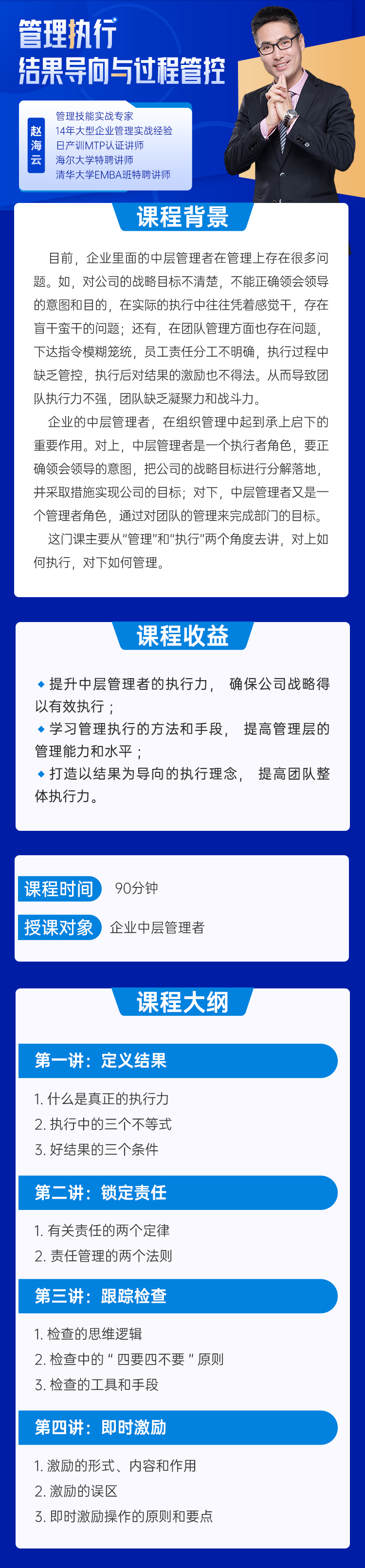 目前,企業(yè)里面的中層管理者在管理上存在很多問題。如,對(duì)公司的戰(zhàn)略目標(biāo)不清楚,不能正確領(lǐng)會(huì)領(lǐng)導(dǎo)的意圖和目的,在實(shí)際的執(zhí)行中往往憑著感覺干,存在課程背景盲干蠻干的問題;還有,在團(tuán)隊(duì)管理方面也存在問題,下達(dá)指令模糊籠統(tǒng),員工責(zé)任分工不明確,執(zhí)行過程中缺乏管控,執(zhí)行后對(duì)結(jié)果的激勵(lì)也不得法。從而導(dǎo)致團(tuán)隊(duì)執(zhí)行力不強(qiáng),團(tuán)隊(duì)缺乏凝聚力和戰(zhàn)斗力。企業(yè)的中層管理者,在組織管理中起到承上啟下的重要作用。對(duì)上,中層管理者是一個(gè)執(zhí)行者角色,要正確領(lǐng)會(huì)領(lǐng)導(dǎo)的意圖,把公司的戰(zhàn)略目標(biāo)進(jìn)行分解落地,并采取措施實(shí)現(xiàn)公司的目標(biāo);對(duì)下,中層管理者又是一個(gè)管理者角色,通過對(duì)團(tuán)隊(duì)的管理來完成部門的目標(biāo)。這門課主要從"管理"和"執(zhí)行"兩個(gè)角度去講,對(duì)上如何執(zhí)行,對(duì)下如何管理。