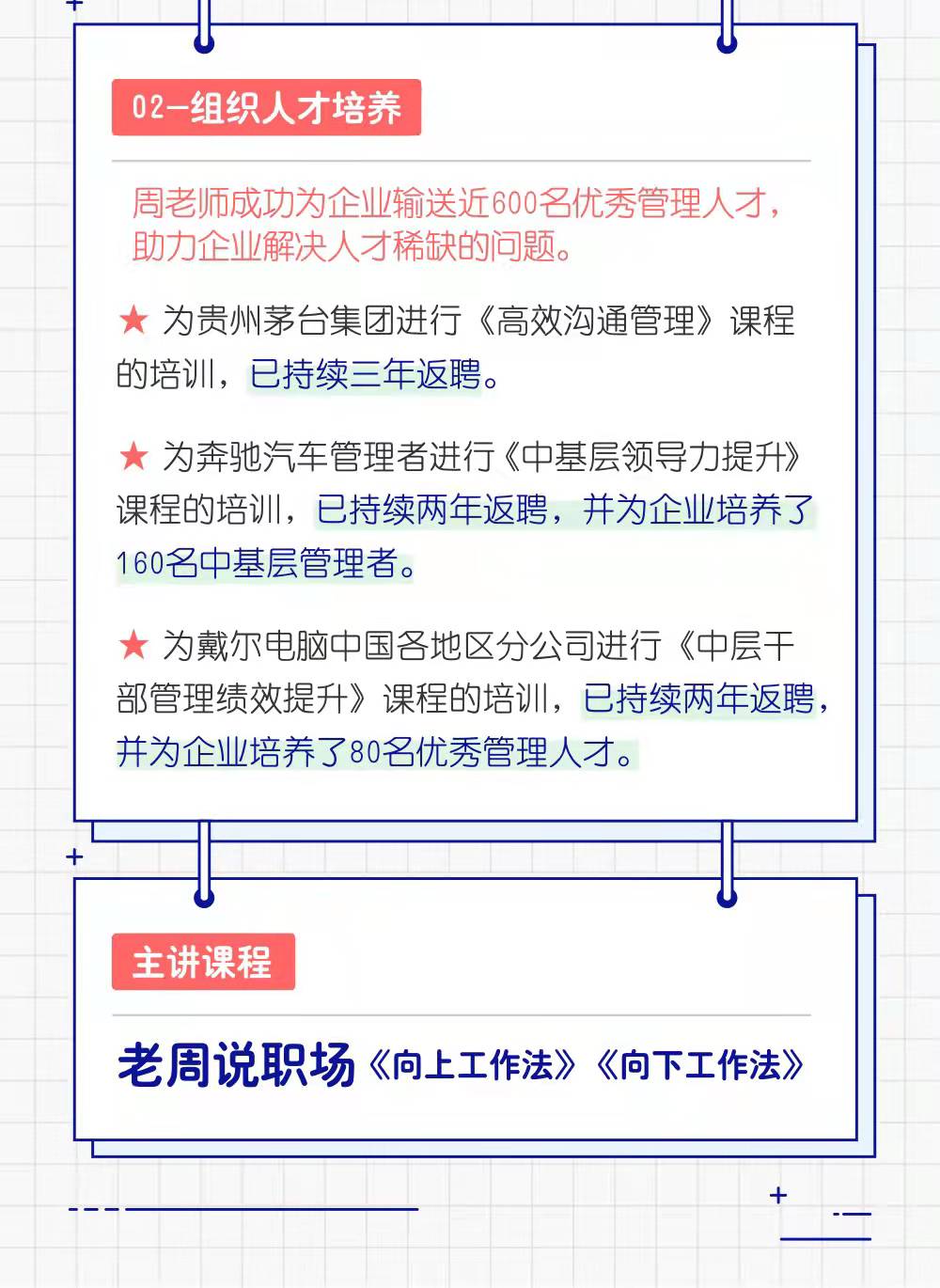 周老師成功為企業(yè)輸送近600名優(yōu)秀管理人才,助力企業(yè)解決人才稀缺的問題。