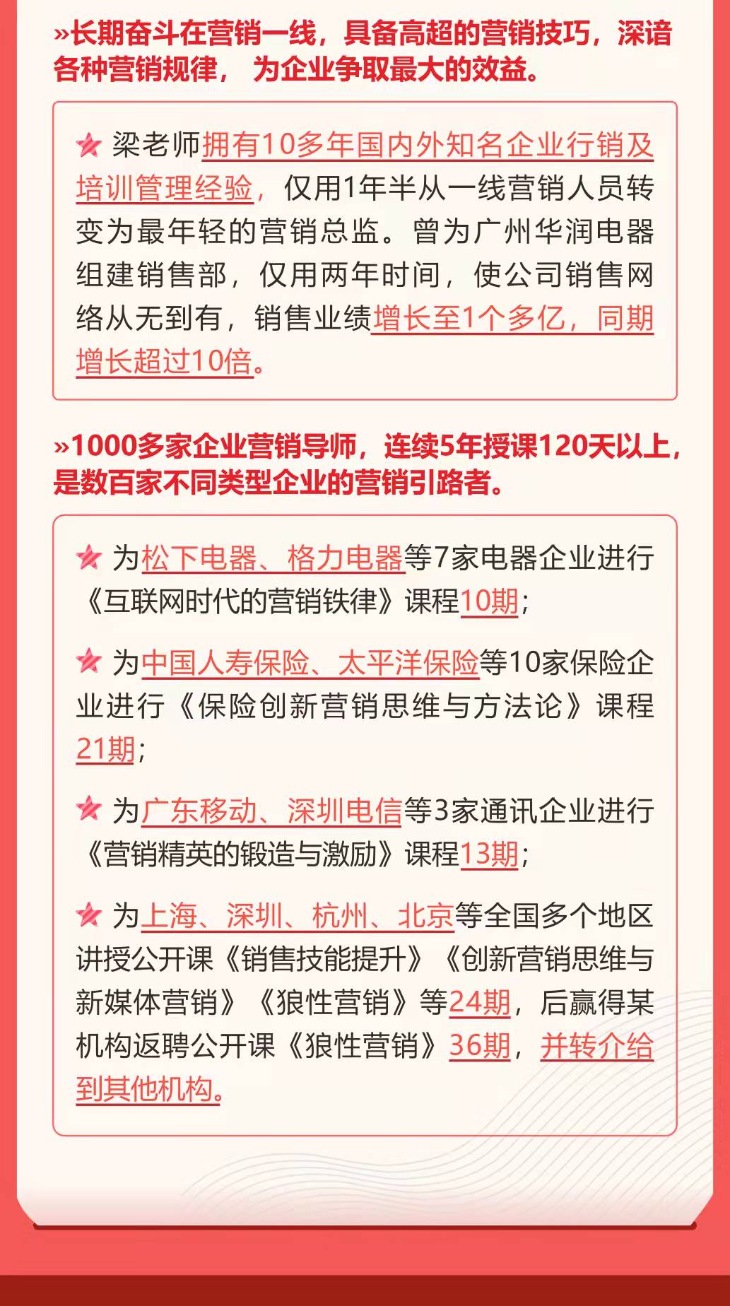 女梁老師擁有10多年國內(nèi)外知名企業(yè)行銷及培訓(xùn)管理經(jīng)驗(yàn),僅用1年半從一線營銷人員轉(zhuǎn)變?yōu)樽钅贻p的營銷總監(jiān)。曾為廣州華潤電器組建銷售部,僅用兩年時(shí)間,使公司銷售網(wǎng)絡(luò)從無到有,銷售業(yè)績增長至1個(gè)多億,同期增長超過10倍。