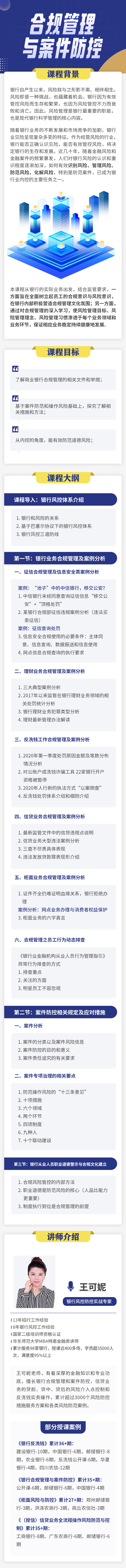 王可妮老師,有著深厚的金融知識(shí)和專業(yè)功底,擅長(zhǎng)銀行合規(guī)管理和案件防控,信貸業(yè)務(wù)的貸前、貸中、貸后的風(fēng)險(xiǎn)介入點(diǎn)控制和反洗錢實(shí)務(wù)操作,累計(jì)超過(guò)3000個(gè)風(fēng)險(xiǎn)防控措施服務(wù)方案和各類風(fēng)險(xiǎn)防范案例。