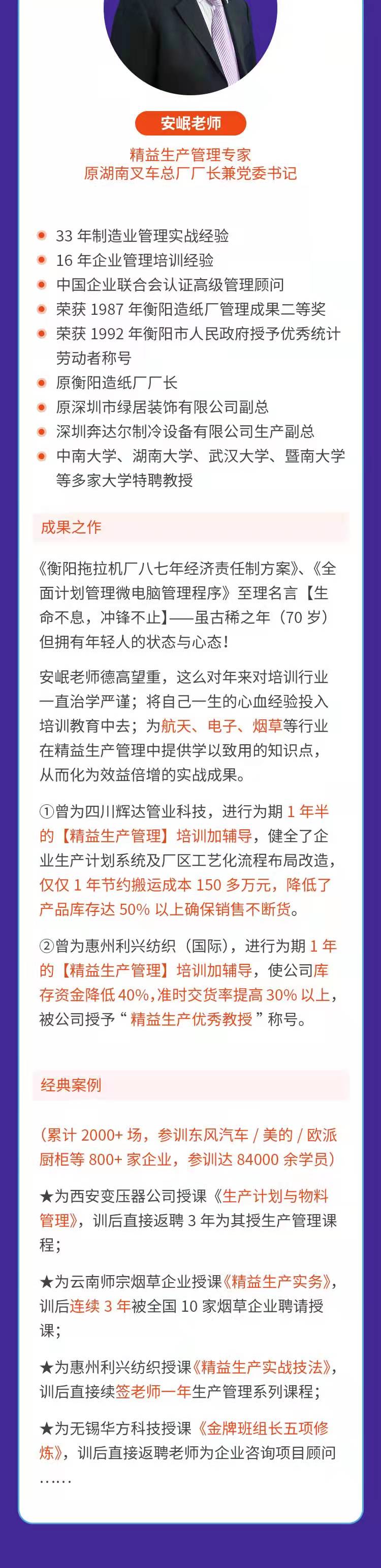 安岷老師德高望重,這么對(duì)年來對(duì)培訓(xùn)行業(yè)一直治學(xué)嚴(yán)謹(jǐn);將自己一生的心血經(jīng)驗(yàn)投入培訓(xùn)教育中去;為航天、電子、煙草等行業(yè)在精益生產(chǎn)管理中提供學(xué)以致用的知識(shí)點(diǎn),從而化為效益倍增的實(shí)戰(zhàn)成果。