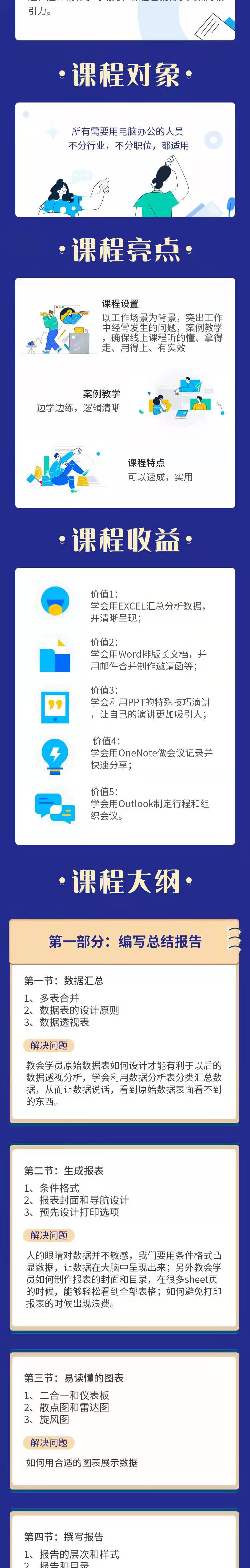 讓學(xué)員通過三個典型工作場景下,如何用 Office 辦公的學(xué)習(xí),大大提升自己處理工作的效處理各種事物,通過典型的場景,和學(xué)員產(chǎn)生共鳴,讓他們發(fā)現(xiàn)學(xué)習(xí)的內(nèi)容就是工作中遇到的問顆。這樣就右學(xué)習(xí)動力。課程就有了天然的吸引力。