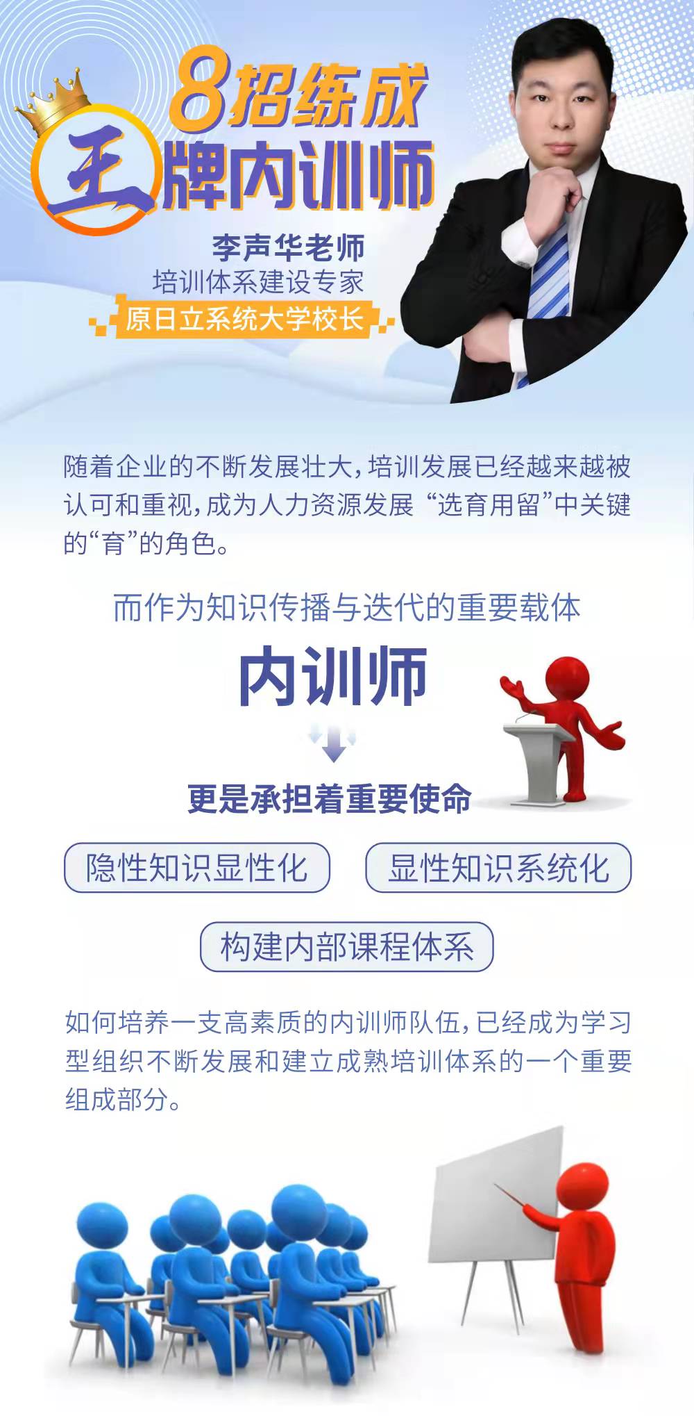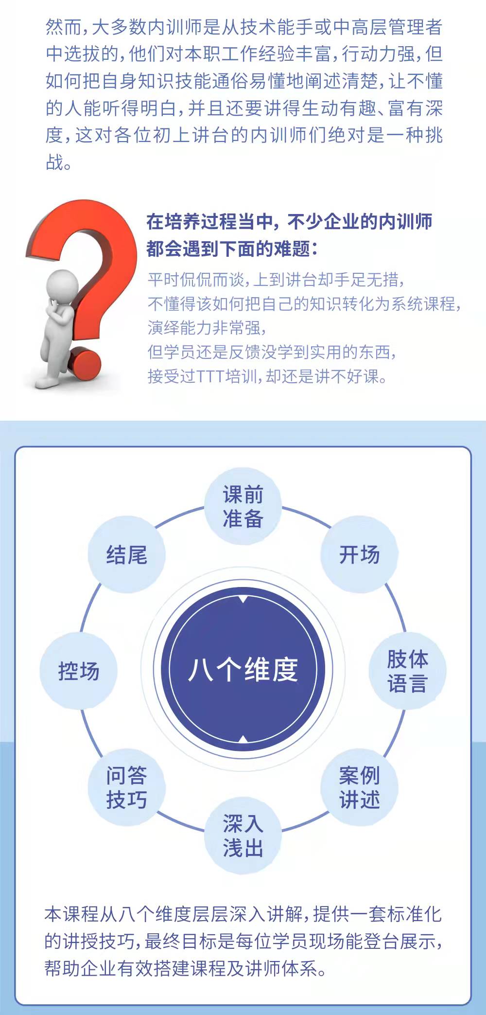 老師課程內(nèi)容全面涵蓋授課技巧、課程開(kāi)發(fā)、課件制作、微課設(shè)計(jì)、培訓(xùn)管理五大領(lǐng)域,并承諾現(xiàn)場(chǎng)產(chǎn)出、優(yōu)化課程;