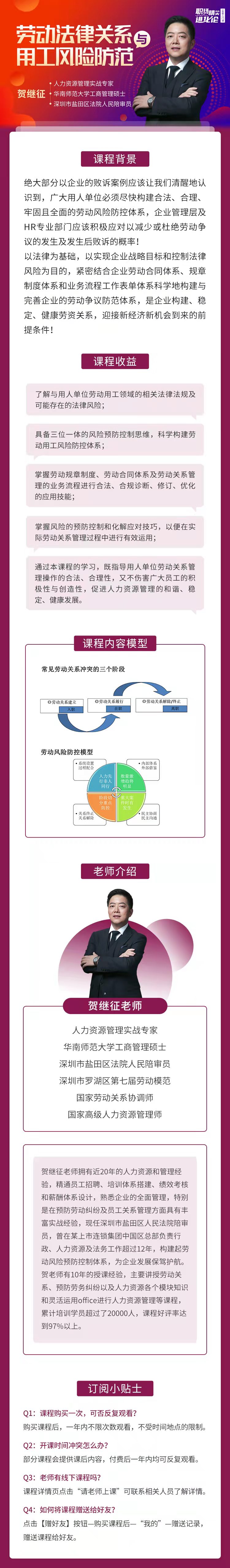 賀繼征老師擁有近20年的人力資源和管理經(jīng)驗(yàn),精通員工招聘、培訓(xùn)體系搭建、績效考核和薪酬體系設(shè)計(jì),熟悉企業(yè)的全面管理,特別是在預(yù)防勞動糾紛及員工關(guān)系管理方面具有豐富實(shí)戰(zhàn)經(jīng)驗(yàn),現(xiàn)任深圳市鹽田區(qū)人民法院陪審員,曾在某上市連鎖集團(tuán)中國區(qū)總部負(fù)責(zé)行政、人力資源及法務(wù)工作超過12年,構(gòu)建起勞動風(fēng)險(xiǎn)預(yù)防控制體系,為企業(yè)發(fā)展保駕護(hù)航。賀老師有10年的授課經(jīng)驗(yàn),主要講授勞動關(guān)系、預(yù)防勞務(wù)糾紛以及人力資源各個模塊知識和靈活運(yùn)用office進(jìn)行人力資源管理等課程,累計(jì)培訓(xùn)學(xué)員超過了20000人,課程好評率達(dá)到97%以上。