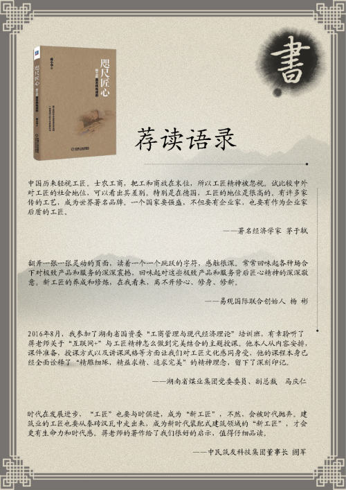 值得一提的是,蔣老師著述此書的過程,也恰恰詮釋了“新工匠”本身。“精華在筆端,咫尺匠心難。”相信你會在這本書里得到自己的收獲。