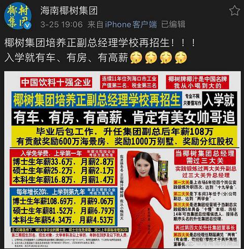 3月25日,椰樹在官方微博上發(fā)布信息招生,招生信息打出沒多久就被海南省市場監(jiān)管局立案調查,原因是發(fā)布涉嫌違法廣告,我們一起來看下這則廣告。