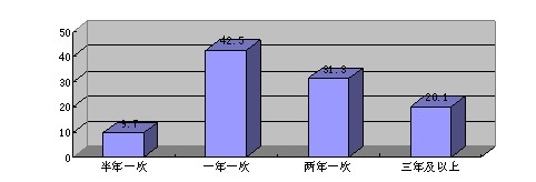 通過對框架眼鏡更換頻率調(diào)查,參與的134人中有9.7%的人半年更換一次,42,5%的人一年換一次,31.3%的人兩年換一次,20.1%的人三年換一次。由此可以看出大多數(shù)人的更換頻率在一到兩年,占了73.8%的比例。