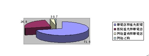 通過調(diào)查,在框架眼鏡購買方式中,參與的133人中有71.4%的人選擇眼鏡店選購和驗光配鏡,24.8%的人選擇醫(yī)院驗光和眼鏡店選購,3%的人選擇網(wǎng)絡(luò)查詢和眼鏡店選購,0.7%的人選擇網(wǎng)絡(luò)選購。由此看到眼鏡店和醫(yī)院驗光的比例較大,占了96.2%,這是對眼鏡店發(fā)展很好的征兆。