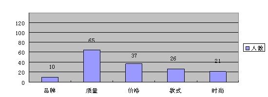 通過調(diào)查發(fā)現(xiàn),在參與調(diào)查的151人中,消費者在購買時考慮因素的選擇中,在首先考慮因素中,居于首位的是質(zhì)量,這類人有78個人,首先考慮舒適度和價格的要相對較低,而且差距很明顯,分別只有26人和20人,在其余的因素中,消費者考慮的都較少。