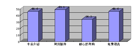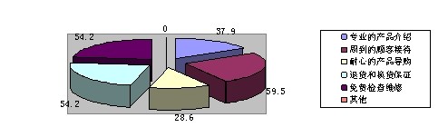 通過對153個消費者在選擇框架眼鏡時較注重的服務(wù)的調(diào)查中,有37.9%的人選擇專業(yè)的產(chǎn)品介紹,59.5%的人選擇周到的顧客接待,28.6%的人選擇耐心的產(chǎn)品導(dǎo)購,54.2%的人選擇退換貨保證,54.2%的人選擇免費檢查維修。從以上數(shù)據(jù)表明,周到的服務(wù)和免費維修及退換貨保證在消費者中反響較大。