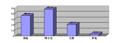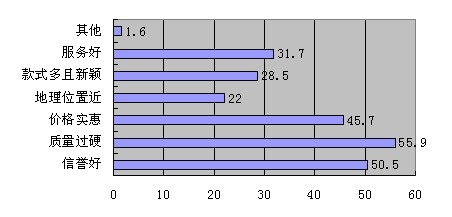 在參與此項調(diào)查的186人中,選擇購買地點,將質(zhì)量過硬放在首位,占55.9%,信譽好占50.5 %,價格實惠的占45.7 %,地理位置近占22%,款式多且新穎占28.5%,服務(wù)熱情周到占31.7%,其他占了1.6%。從上述數(shù)據(jù)看,在選擇購買地點時,消費者將質(zhì)量放在首位者居多,其次為信譽及價格等。
