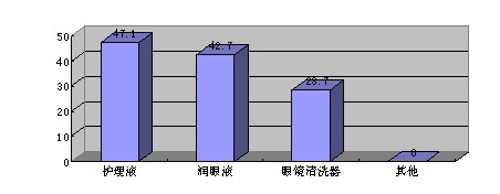 通過調(diào)查,隱形眼鏡配套產(chǎn)品選擇的157人中,有47.1%的人選擇護理液,有42.7%的人選擇潤眼液,還有28.7%的人選擇了眼鏡清洗器。數(shù)據(jù)表明,在隱形眼鏡的配套產(chǎn)品中護理液和潤眼液的比例較大,占了89.8%的比例。