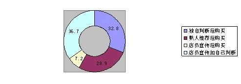 通過調(diào)查,對于消費者如何做出購買決策,在參與調(diào)查的180人中,有32.8%的人是獨自判斷后購買的,28.9%的人是聽從熟人推薦后購買的,7.2%的人是聽從店員宣傳后購買,36.7%的人是店員宣傳加上自己判斷后購買的。