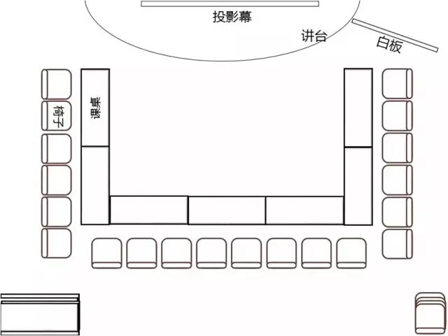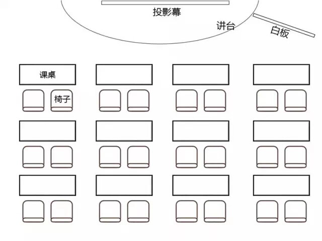 一些需要兩人討論互動的培訓中,課堂里的桌椅經(jīng)常有下圖的擺放方式: