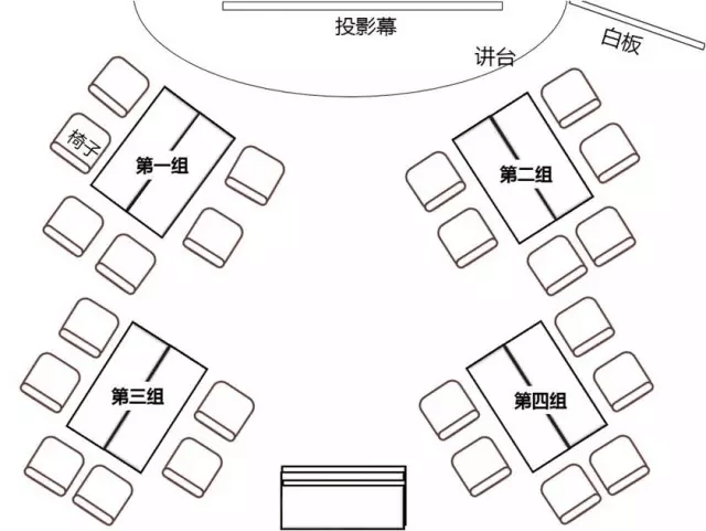 那么在培訓課堂上呢?最常見的一種是島嶼式的桌椅排列,就是一個個小組就像小島一樣,這樣在培訓當中比較適合分組,也非常方便討論。像這類排列會發(fā)現(xiàn)教室底部堆積了一些桌子,為了減少占用空間,此時培訓的桌椅堆疊性強的話就非常有用。如下圖所示: