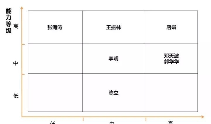 如上圖,這家企業(yè)劃分的標(biāo)準(zhǔn)就是屬于高是80分以上,60分到80分屬于中等,60分以下屬于低,不管是績(jī)效考核還是能力測(cè)評(píng)都按照這個(gè)標(biāo)準(zhǔn),我剛才提供這個(gè)圖片里面,這幾個(gè)人按照這個(gè)高中低來劃分,我們可以把他放在九宮格里面去。如下圖:
