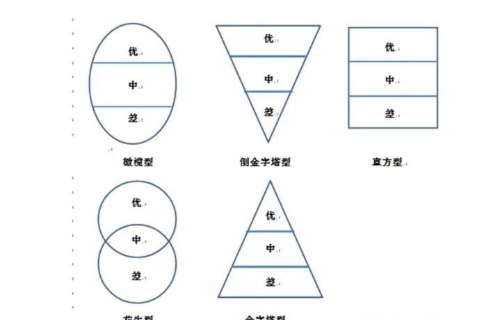 接下來跟大家介紹一個(gè)人才素質(zhì)結(jié)構(gòu)圖,按照整個(gè)測(cè)評(píng)對(duì)象的團(tuán)體的測(cè)評(píng)成績(jī),我根據(jù)優(yōu)、中、差三個(gè)等級(jí)的人數(shù)的不同,將人才素質(zhì)結(jié)構(gòu)分為以下五種類型:第一種是橄欖型;第二種是倒金字塔型;第三種是正方形;第四種是花生型;第五種是金字塔型。從這幾個(gè)圖我們可以非常直觀地看出,整個(gè)公司人才素質(zhì)狀況到底是怎么樣的。如下圖: