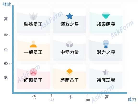 人才盤點(diǎn)九宮格是人才盤點(diǎn)的典型工具,通常從能力、潛力和績(jī)效三個(gè)維度形成績(jī)效,AskForm人才盤點(diǎn)九宮格則支持自定義,績(jī)效和能力、潛力、敬業(yè)度等維度組合分析,得到更全面的數(shù)據(jù),盤點(diǎn)結(jié)果可應(yīng)用于以下幾個(gè)方面: