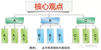 課程伊始,老師表示:如果有人希望通過(guò)閱讀來(lái)了解作者對(duì)某一問(wèn)題的看法,將面臨著一項(xiàng)復(fù)雜任務(wù)——即使文章篇幅不長(zhǎng),他也需要閱讀、理解上百個(gè)句子,并將這些句子融會(huì)貫通。如果培訓(xùn)結(jié)構(gòu)呈金字塔形,觀點(diǎn)自金字塔頂部逐漸向下展開,就能更快、更有效地幫助學(xué)員理解(見圖表1)。